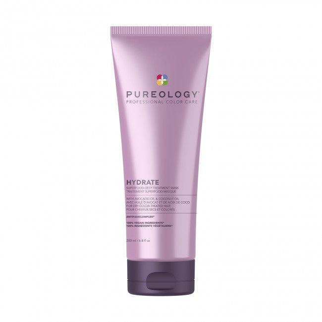 Hydrate Superfood Nourishing treatment with essential nutrients that intensely moisturizes and softens hair. Pureology Hydrate Superfood Treatment deeply hydrates dry, color-treated hair with key ingredients Avocado Oil and Coconut Oil and a signature aromatherapy blend of Pineapple, Coconut, and Vanilla.